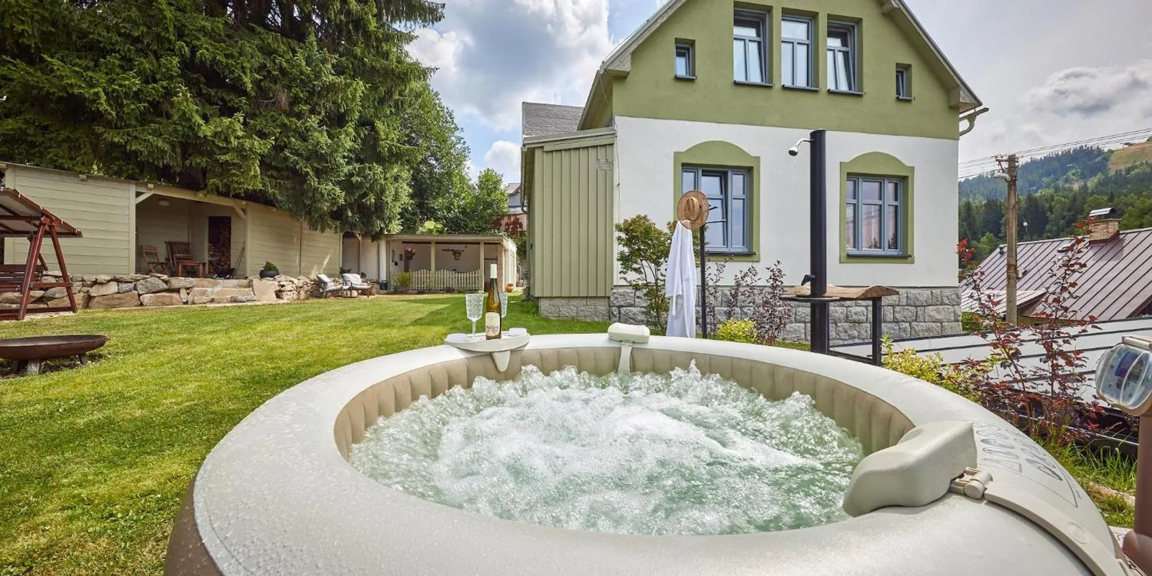 Villa in Jablonec with Sauna & Hot Tub, que tiene jardín y terraza, dispone de alojamiento en Albrechtice v Jizerských horách con wifi gratis y vistas al jardín.