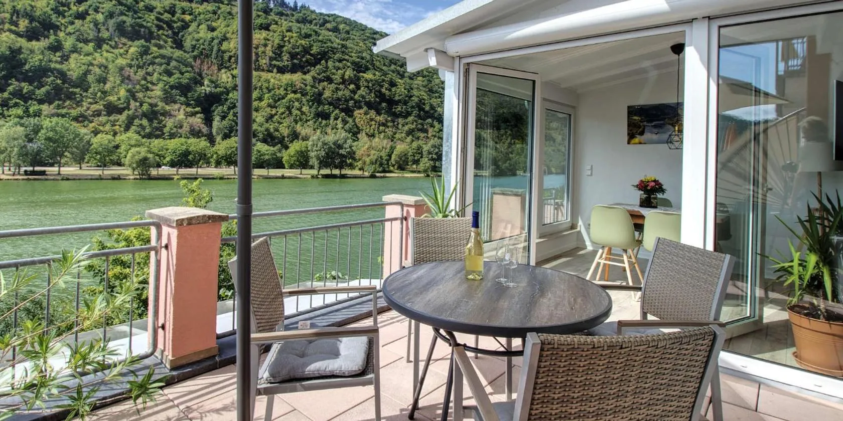 Traumaussicht Kamin Balkon Burgblick 65 Zoll TV Netflix Waipu Lindenplatz, que cuenta con salón de uso común, terraza y restaurante, ofrece alojamiento en Bullay con wifi gratis y vistas a la montaña.