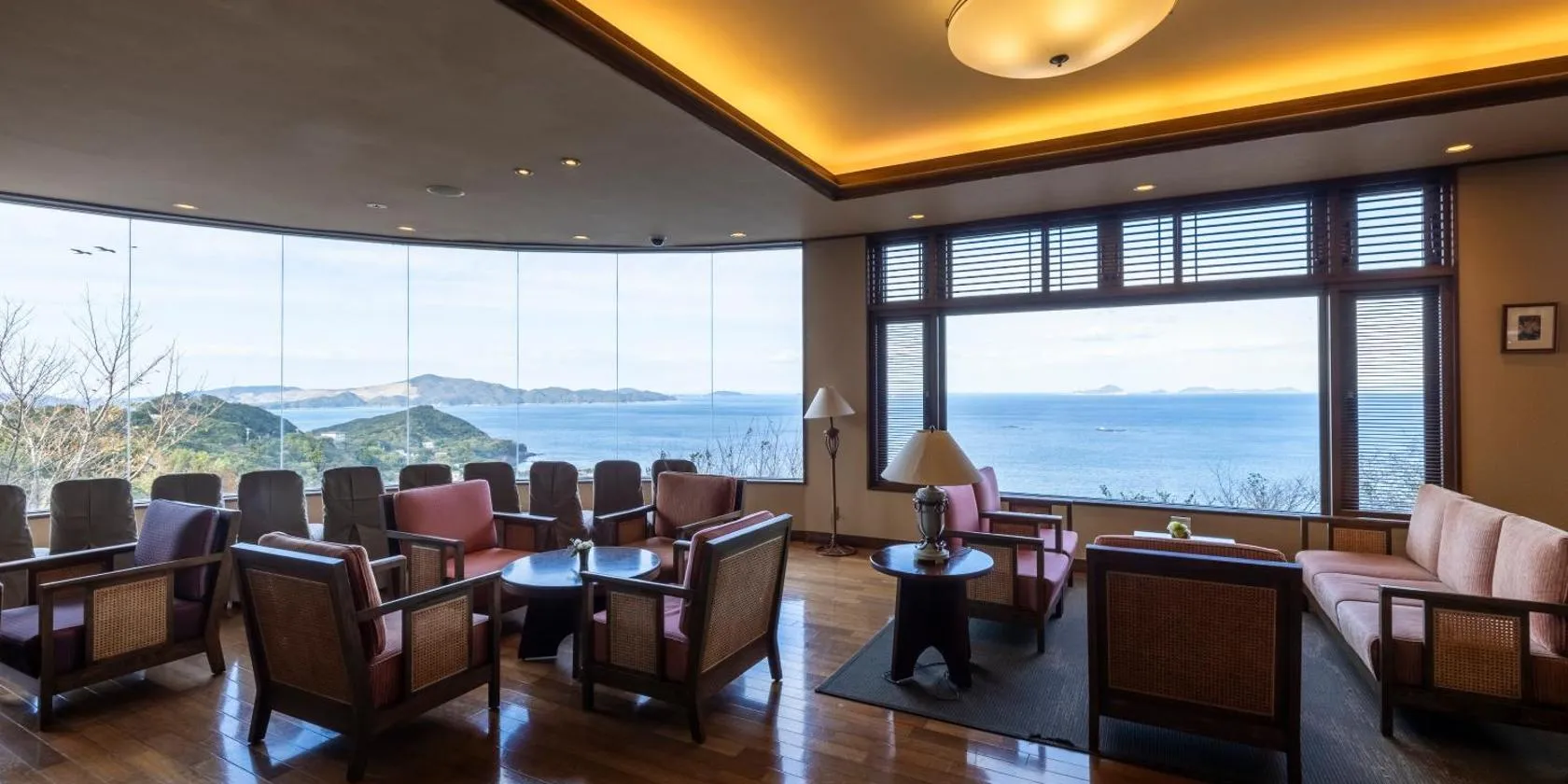 El Senpokaku goza de vistas a la ciudad de Toba y a la bahía de Ise y cuenta con un salón de té y baños naturales de aguas termales con vistas panorámicas.
