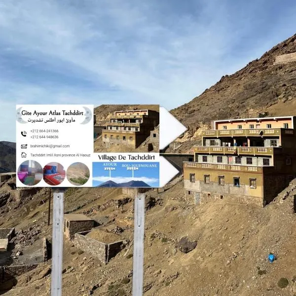 Το Gîte Ayour Atlas Tachddirt προσφέρει καταλύματα στον προορισμό Tacheddirt. Το κατάλυμα προσφέρει σημείο πώλησης πάσου για σκι, απευθείας πρόσβαση σε πίστα σκι, κοινόχρηστο χώρο lounge και βεράντα.