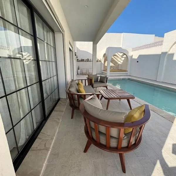Villa Chaâbane, que se encuentra en Djerba, ofrece alojamiento con piscina privada, vistas a la piscina y patio.