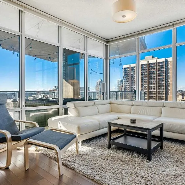 Το Downtown Sunny Highrise Corner Condo Sleeps 7 προσφέρει δωρεάν WiFi, αίθουσα γυμναστικής και κλιματισμό.