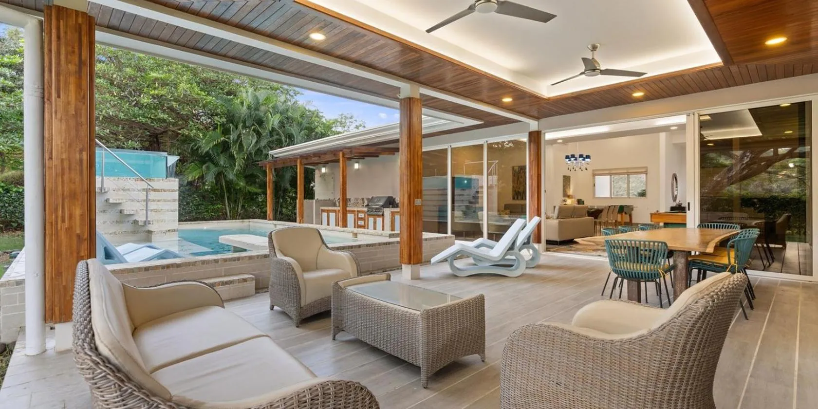 Stylish 2-Bedroom Beach Condo with Ocean-View Deck, Lush Pool Area & 2-Minute Walk to Flamingo Beach, que está en Playa Flamingo, tiene aire acondicionado y ofrece alojamiento con patio.