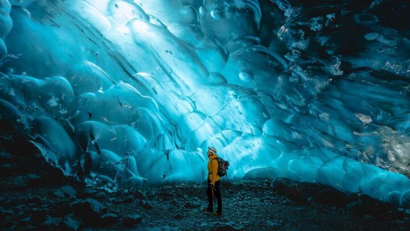 Σπήλαιο πάγου και περίπατος στον παγετώνα στο φαράγγι Blue Glacier