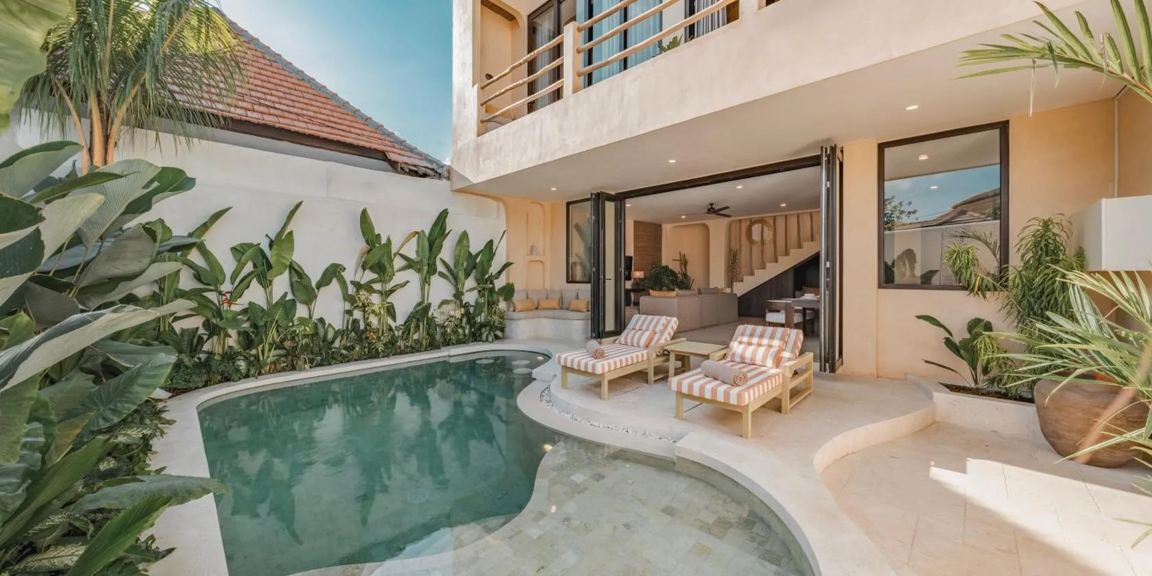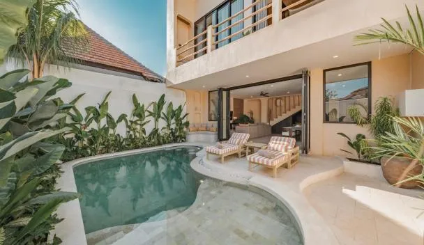 El Ini Vie Villa Seminyak by Ini Vie Hospitality es un alojamiento acogedor y elegante situado en Legian que cuenta con bañera de hidromasaje y piscina, donde hay un flotador y sofá colgante.
