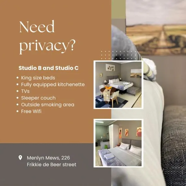 Το Luisa's Place, που βρίσκεται στην Πρετόρια, προσφέρει δωρεάν WiFi και θέα στον κήπο. Έχει επίσης βεράντα.