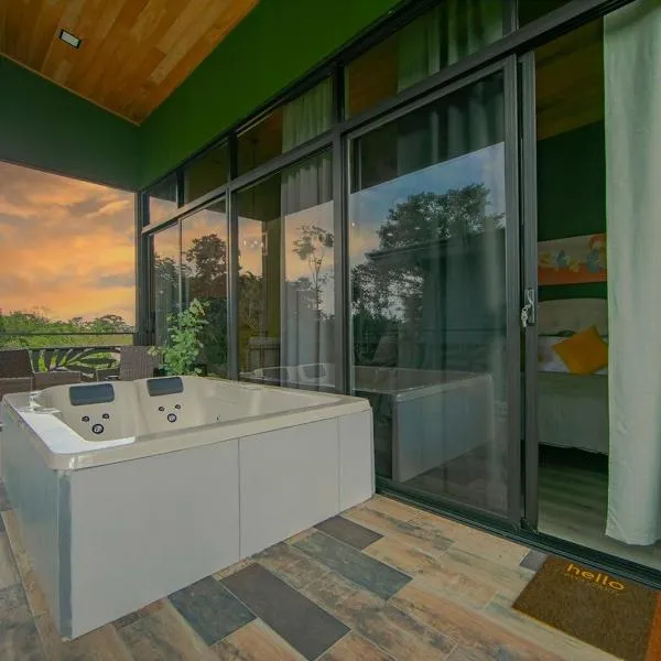 Το Arenal Nephelium Country Home, Refugio rural con piscina, jacuzzi y balcón con hermosas vistas al Volcán Arenal, en una finca privada έχει θέα στον κήπο και παρέχει βεράντα και μπαλκόνι.